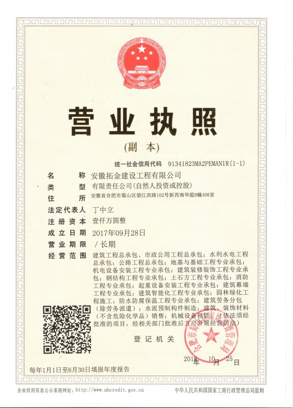 安徽拓金建設(shè)工程有限公司成立于2017年9月,正值金秋收獲季節(jié),公司目前注冊(cè)資金500萬元。